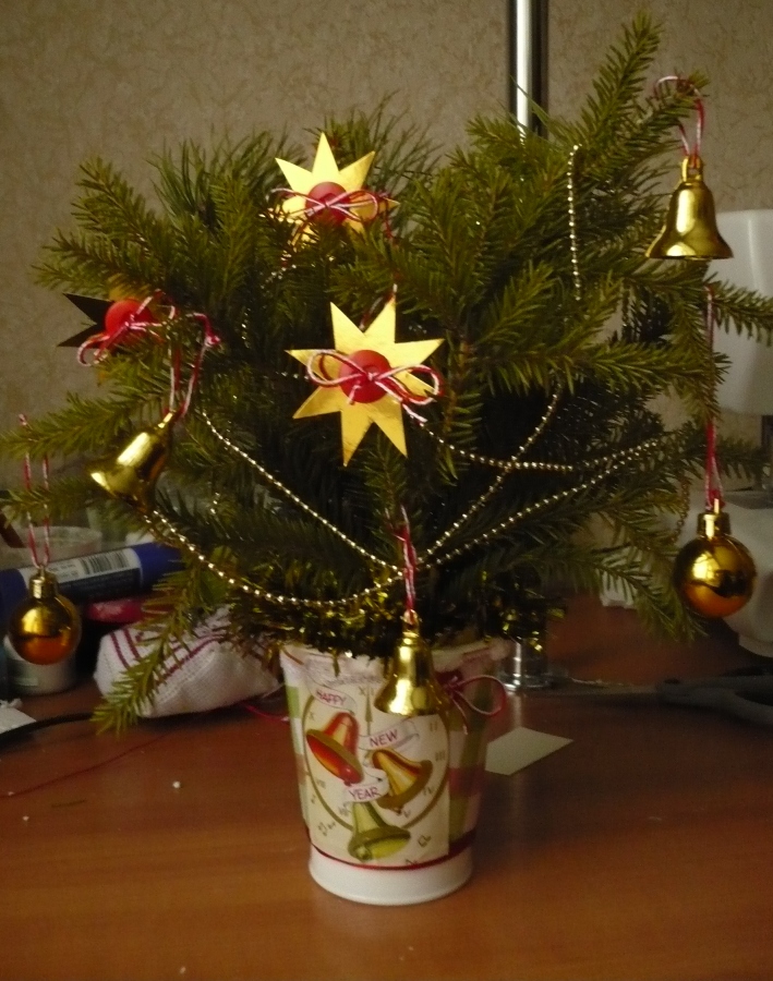 "Здравствуйте, читатели блога, сегодня будем делать вот такое украшение для стола. Этот вариант декора отлично подойдёт для рабочего стола в офисе, также если вы не любите дома ставить ёлку, для праздничного стола или как дополнительное украшение на полку к ёлке.