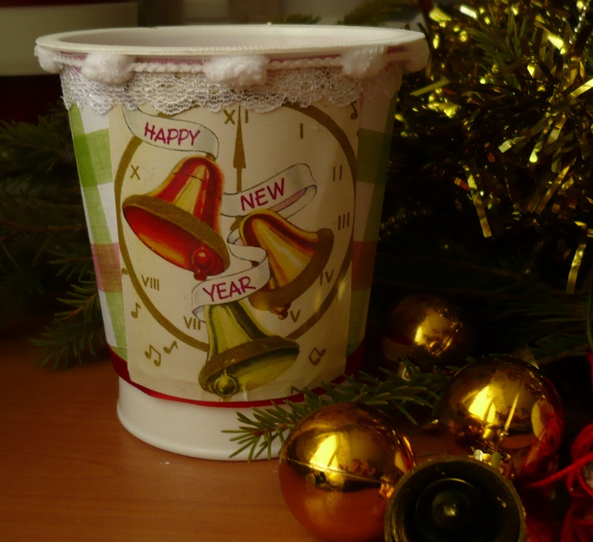 материалы: пластиковый стакан из под сметаны или йогурта, пенопласт или флористическая губка, еловые ветки, новогодние украшения, мишура, скрапбумага и детский яркий картон, кружево, распечатанная картинка, нитки и пуговки, спирт.