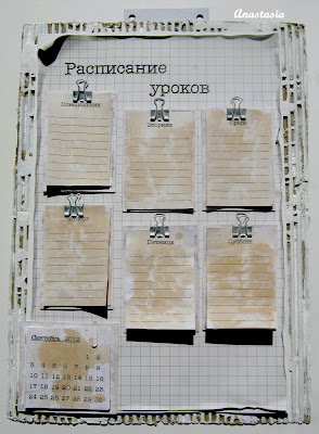 Пока скрепки сохнут мы приклеиваем бумажный отрезок 20х30 см «Расписание уроков» к картону. Края скрапбумаги немного загнула.