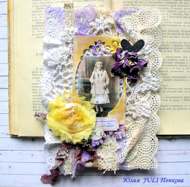 - натуральное кружево, шитье, тесьма "из бабушкиного сундука", состаренное, потрепанное, возможно тонированное, кусочки натуральных тканей, марля, сетка;